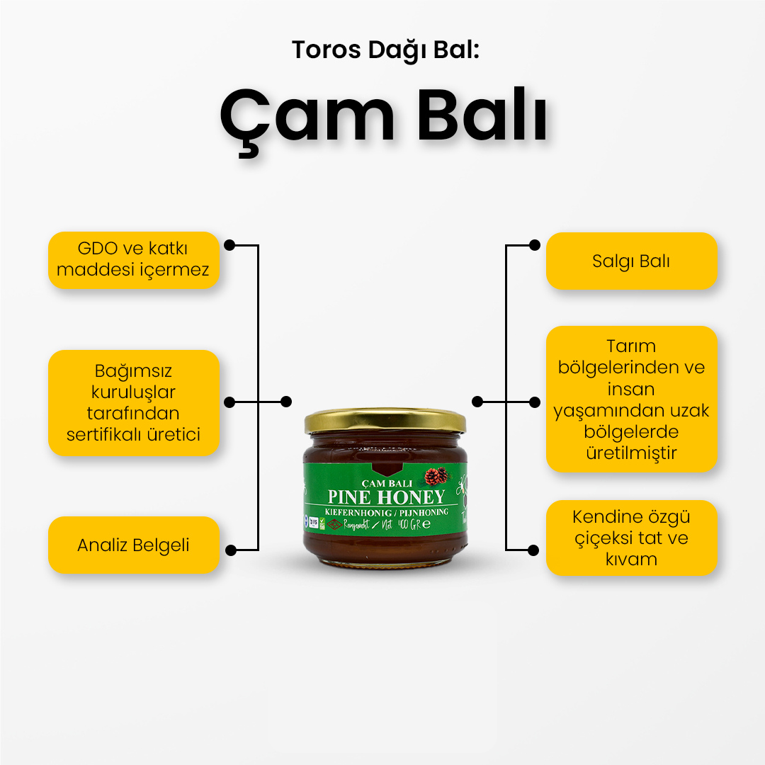 Bu salgı balı, floral ballara göre daha koyu renge, yoğun kıvama ve tok bir lezzet profiline sahiptir. Çam Balı, hızlı kristalize olmayan bir yapıya sahiptir.